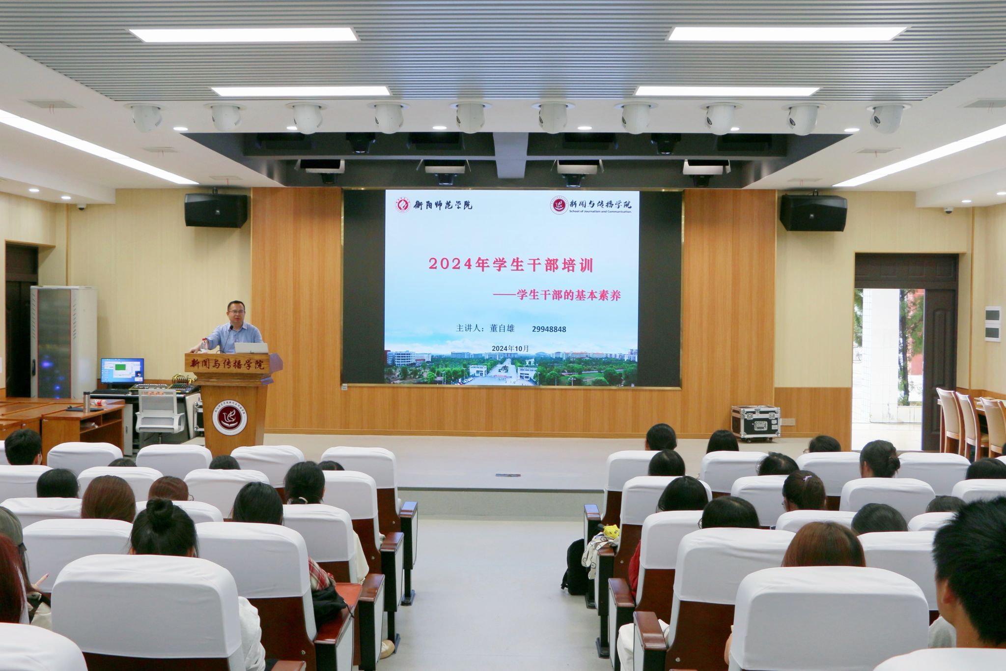 接着,董自雄副书记强调学生干部需要具备肯吃苦、有进取心、正直诚实等基本素质。他还指出了学生干部存在的“缺乏活力、动力、合力、魄力。”等问题,并希望大家可以改正。