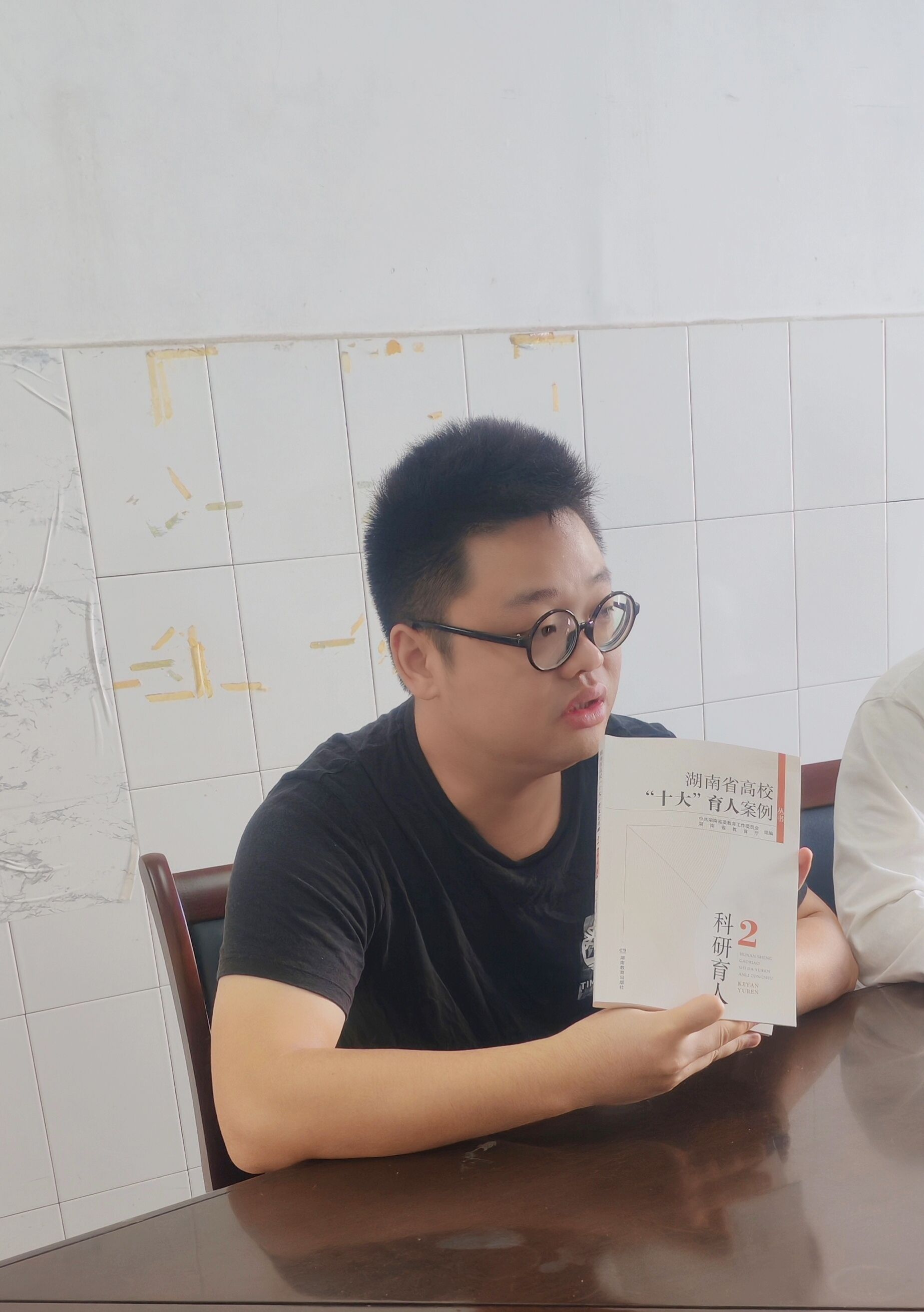 活动一开始, 吴书越老师向大家分享了他对《湖南省高校“十大”育人案例》中的科研育人的感受。他表示,书中南华大学通过数学建模大赛育人的案例,让他联想到物电学子在国家级、省级大学生电子设计大赛,物理竞赛等多项比赛中获得的优异成绩。他认为这些竞赛的经历对学生未来升学与就业具有重要意义,通过学科竞赛及相关科研活动可以提高学生的综合能力,提高理工科学生的人才培养质量。