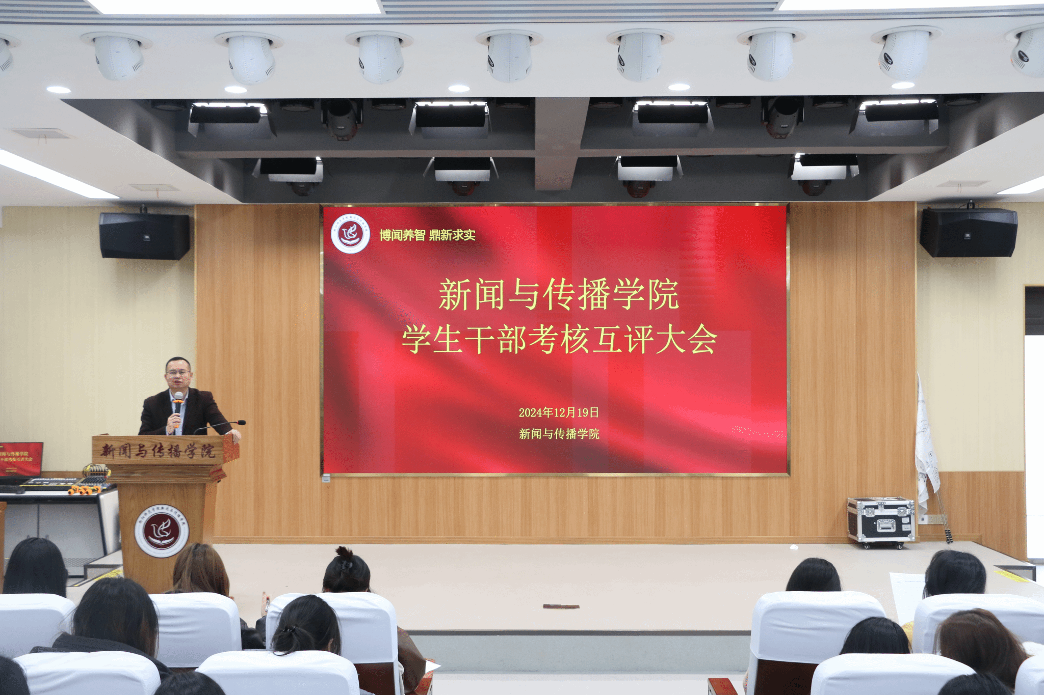 为全面评估学生干部在本学期内的工作表现,促进团队协作与自我提升,12月27日,我院于文科楼一楼演播厅召开了学生干部考核互评大会。本次会议由党总支副书记董自雄、学工办副主任兼团委书记封伟为老师、辅导员刘国杰老师和辅导员叶子凌老师出席会议,主席团、各部门部长副部长以及各班班委参会。