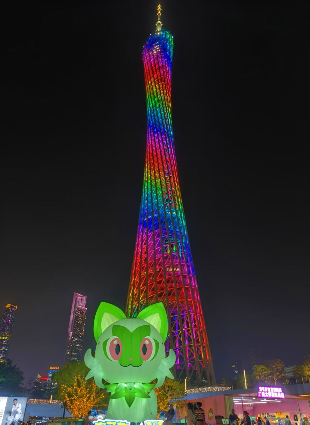 夜幕降临,广州塔在夜色中闪耀着绚丽多彩的光芒,红、橙、黄、绿、蓝、靛、紫交织,宛如一条梦幻的彩色丝带直插夜空。塔下,一只萌态可掬的绿色卡通造型气模引人注目,大大的眼睛透着灵动。周围人群熙攘,热闹非凡,灯光点缀着树木,一旁的店铺招牌闪烁,共同绘就一幅活力满满的都市夜景图。