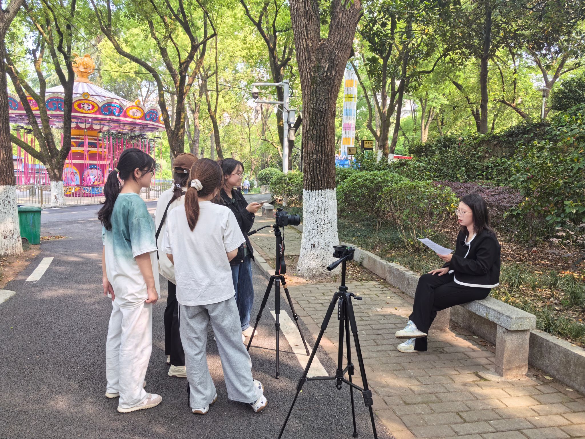 高爽小组的镜头则对准了南湖景区。他们采访了南湖景区管理科罗雁科长,并补拍景区游客镜头。拍摄途中,一群放风筝的孩子闯入画面,彩色的纸鸢与湖面波光交织。组员们为小朋友们拍下大合照,将孩子们举着风筝线奔跑的笑脸在镜头下定格。