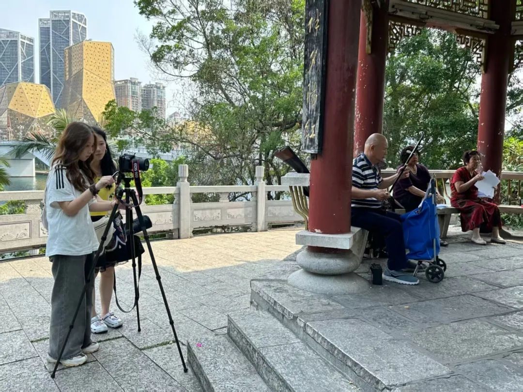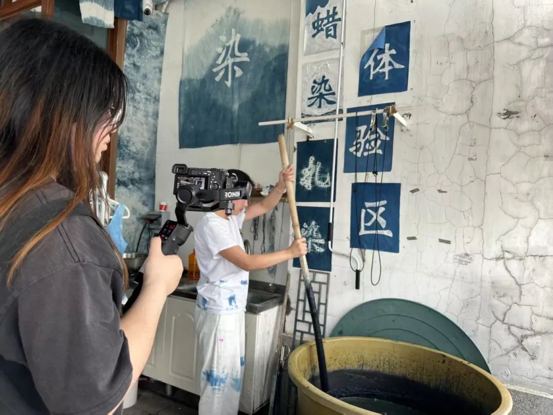 上午我们前往南车渡码头,在附近的公园对拉曲唱歌的居民进行拍摄,之后乘坐水上公交去往窑埠古镇,对古镇内部的一间扎染作坊进行体验拍摄。染料在素布上洇开,青蓝叠着淡紫,似云絮漫过晴空。我们还采访了扎染作坊的师傅,了解扎染技艺的历史和传承,感受到了柳州传统文化的独特魅力。