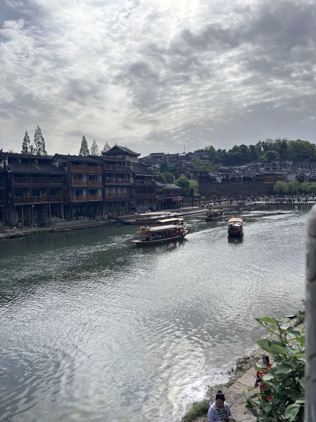 漫步于凤凰街巷,一只小狗在青石板上慵懒晒着太阳,成员们驻足逗弄,镜头里小家伙眺望远方的模样,恰是古城惬意生活的生动剪影。沱江水面泛起温柔涟漪,吊脚楼倒影随波晃动。小组成员们举着手机定格每一帧风景,亦捕捉到彼此眼中闪烁的灵感。夜幕降临时,古城灯火渐次点亮,各小组的实践记录仍在继续。