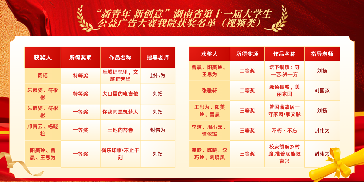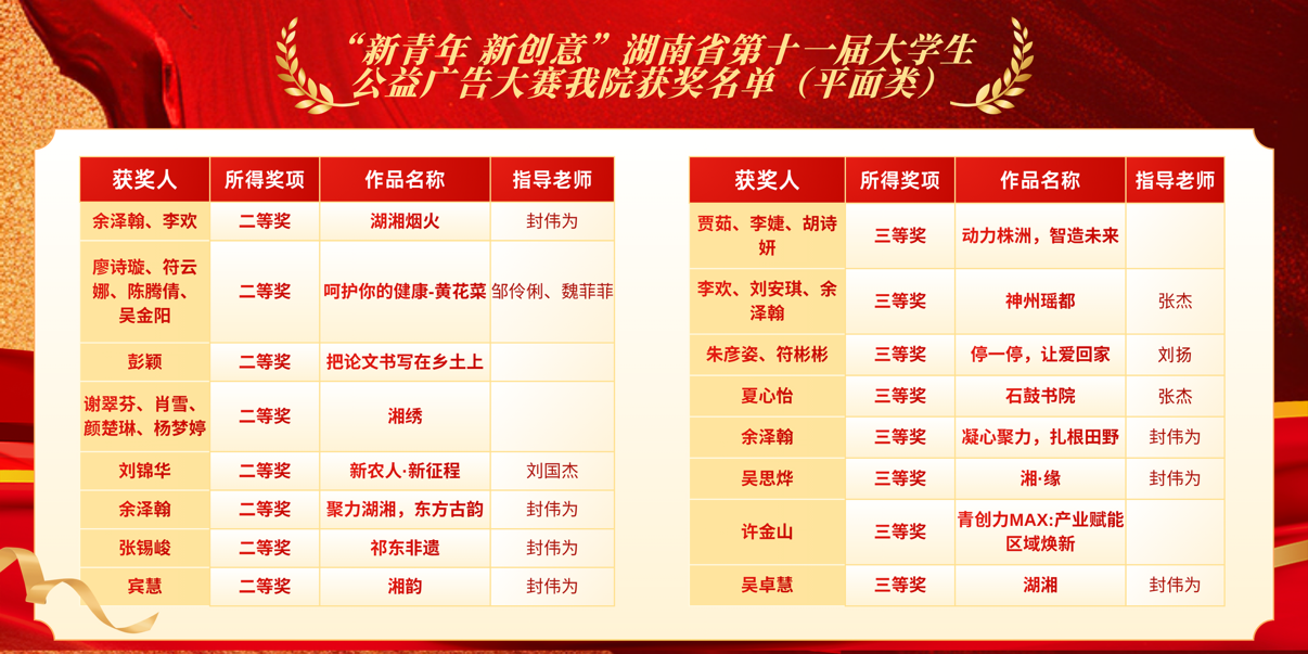我院学子积极参与,创作出多件兼具创意与公益价值的作品。在公益广告大赛视频类作品中,封伟为老师指导的学生《雁城记忆里,文旅正芳华》、刘扬老师指导的《大山里的电吉他》两作品获视频类特等奖,《你我同是筑梦人》等9件作品获视频类分别获一、二、三等奖;平面类作品中,《湖湘烟火》等7份作品获平面类二等奖,《动力株洲,智造未来》等8份作品获平面类三等奖。