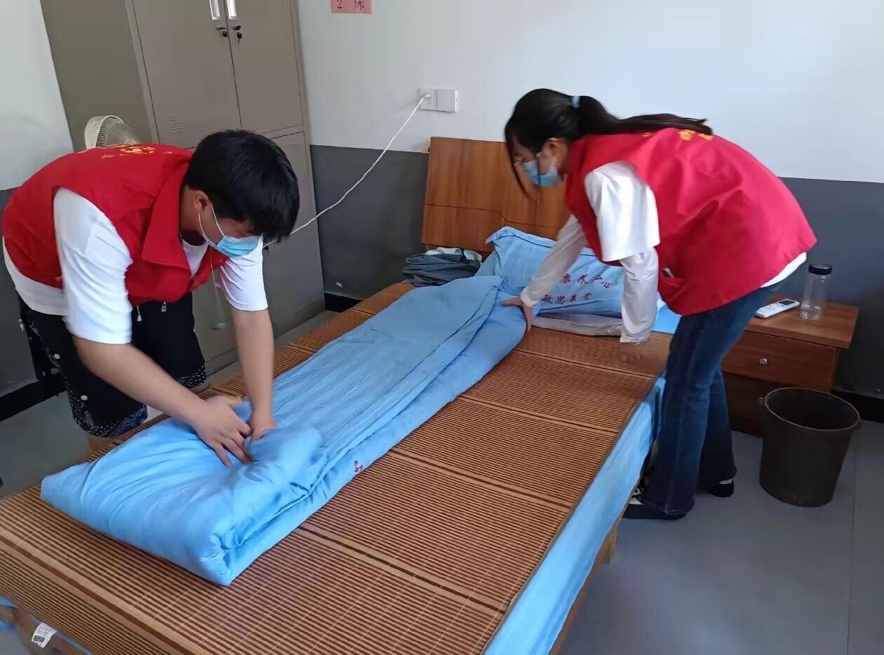 参加活动学生为老人整理被子