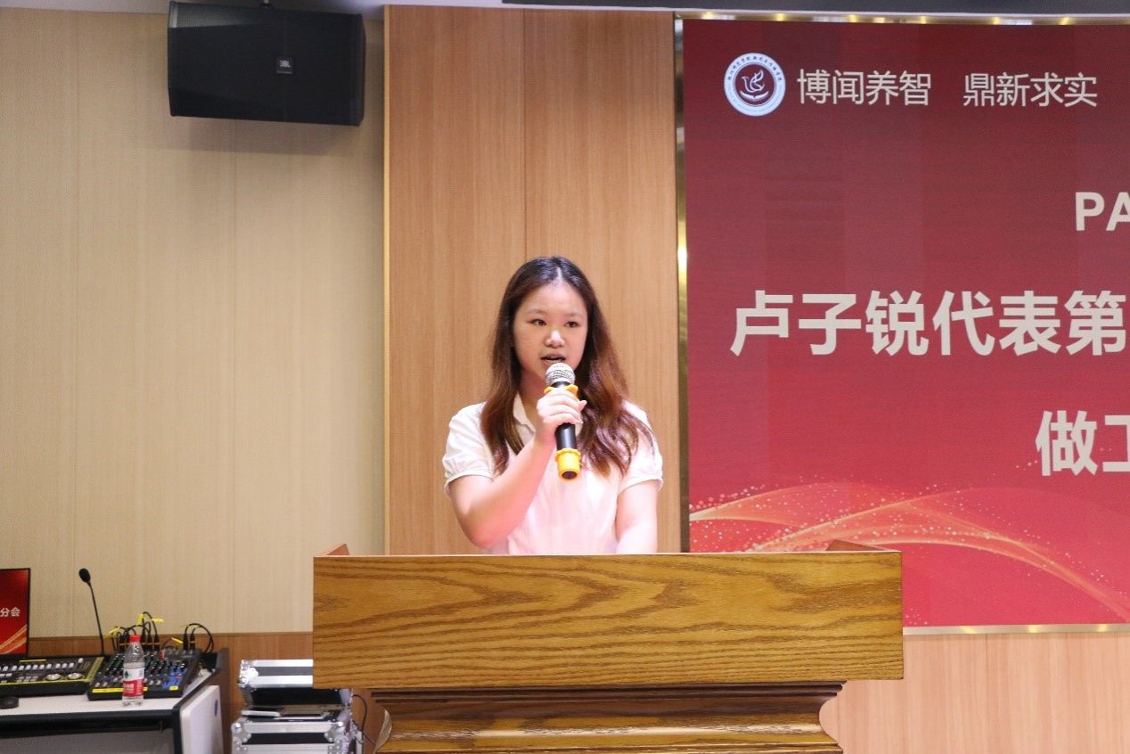 会议中,第二十二届主席团执行主席卢子锐发表述职演讲,她对新一届团学学生干部说道:“大家在工作中,遇到困难,要主动向老师寻求帮助,及时汇报工作进度,同时面对挑战,也要保持奋发进取的精神。”