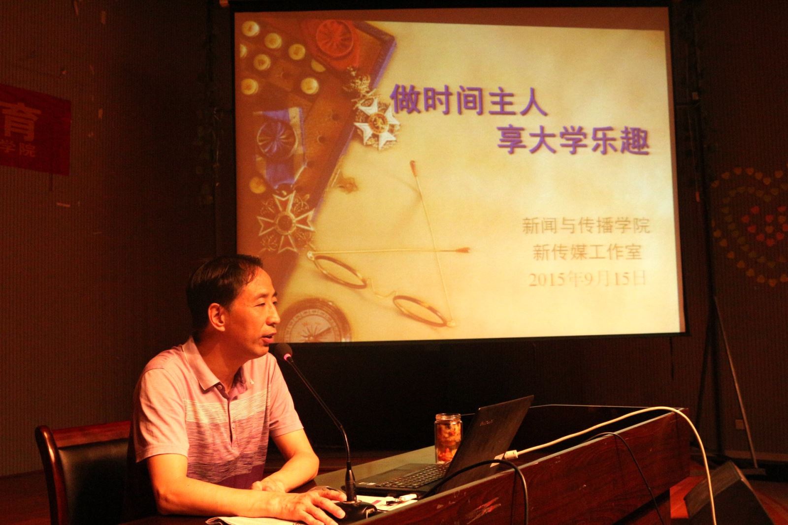 第二场座谈会的现场不时传来阵阵欢笑声。邓玉久书记展示的充满网络特色的PPT和朴实又个性化的语言赢得了同学们的热烈反响。邓书记首先跟大家分享了自己的大学记忆,希望大家能珍惜大学的四年时光。接着,邓书记在思想道德及个人修养等方面结合自身的经历告诫新生们要在大学四年里好好充实自己,学会做人,怀揣着一颗感恩的心去对自己的父母和身边的老师同学,将来争取成为一名栋梁之才。