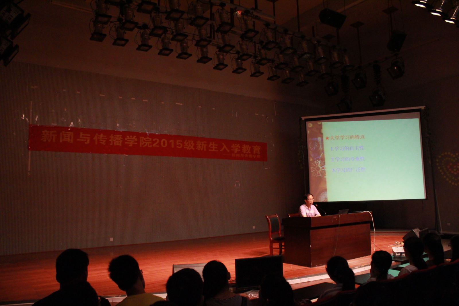 为配合学院教学工作的展开,更好的让新生们融入到大学生活中来,9月14日至20日,我院接连在模拟演播厅召开四场2015级新生入学教育活动。主讲人分别为我院党总支书记邓玉久,党总支副书记周新文,院长汤劲,辅导员资禹剑。