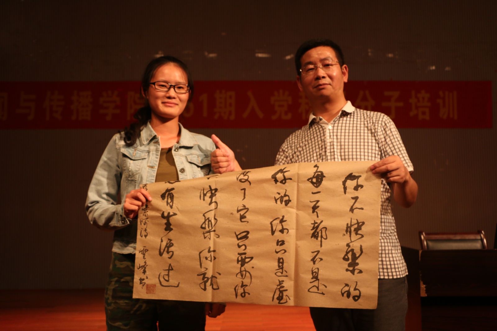 最后,张云峰书记提醒同学们应该抓住自己的定位,听从党的指挥,共同缔造未来的共产主义,建设未来的祖国。同时,张云峰书记将自己的书法作品赠与学生,鼓励大学生过一种有精神、有态度、有价值、有诗意的生活。